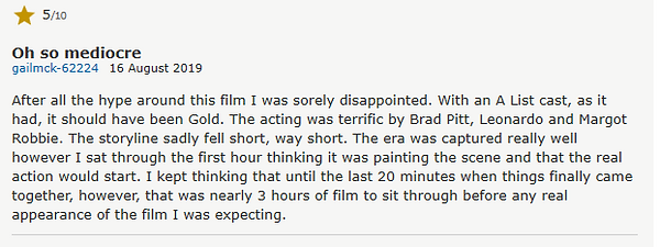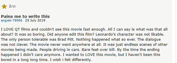 In this review they said that the film was boring. They also said that the Leonardo's character was not likable. They said that Brad Pitt was the only decent character. hey said that the dialogue was not clever. They said that the scenes were of movies being made. They said nothing positive about the film.