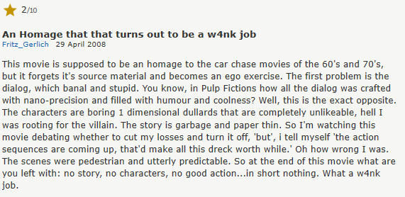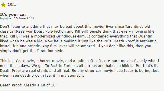 In the review they liked that the film is authentic, brutal, fun and artistic. They liked that it is a car movie and a horror movie. They also liked that the stunts are real.