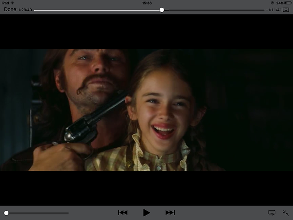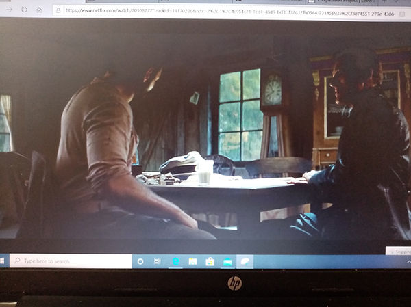 In this scene they use a close up to show the actors expression where as one is serious and the other is laughing. The props they use is a gun and a chair. The lighting in the scene is dark from inside but they are placed next to a window so the lighting is brighter. They are place in a shed for this scene. I think that in this scene they are acting.