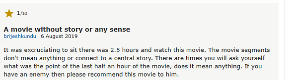 In this review they disliked the length of the film.They said that the films story like didn't make sense. They wondered why they sat through the film. They said nothing positive about the film.