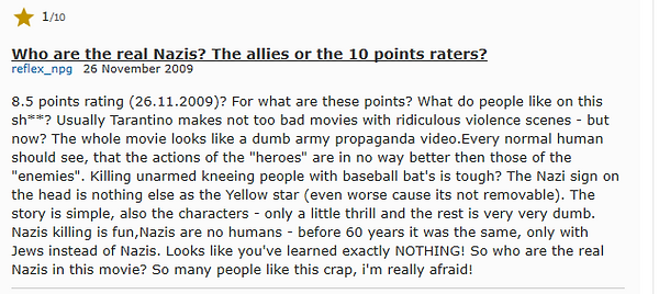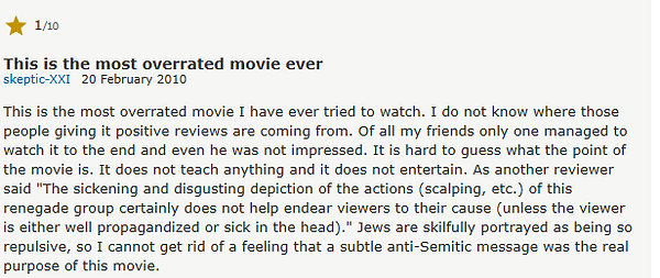 In this review they said that the film was over rated. They didn't like how the film doesn't teach or entertain. The didn't like how the Jews were being seen in the film. They don't get the real purpose of the film.