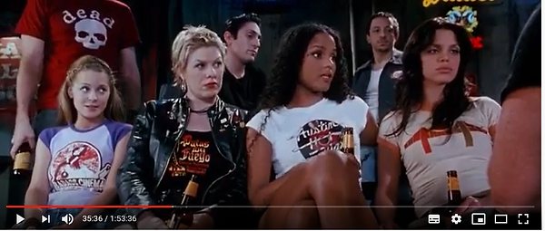 In this scene they use a low angle camera shot to capture the group of friends sitting together. The props the use in this scene is the bench that they are sitting on and the beer bottles. The lighting in this scene is that it is bright around the where the group of friends is sitting. The décor is outside of the bar. In the scene it is raining so this reflect the genre. They used dark colours to show how scared the girls are talking to the guy. In this scene I think that he is trying to gain there trust and more knowledge about them before he injures them.
